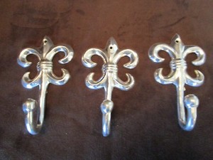 Fleur De Lis Polished Aluminum set 3 Wall Mounted Hook Hanger Hats Keys 6.5”tall